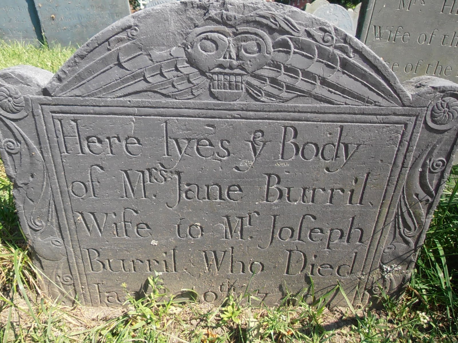 New England is full of awesome cemeteries.  Exploring them is one of our favorite new hobbies. Blame my mom for instilling in me a love of all things ghostly. I must say that the carving on the headstone is pretty creepy.